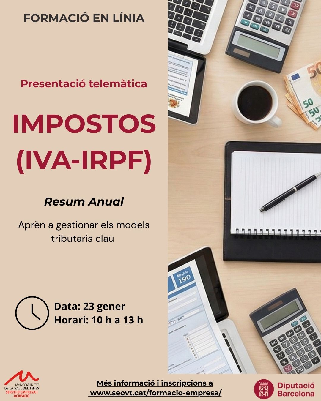 El pròxim 10 d’octubre, de 9:30 a 13:30 h, connecta al taller en línia sobre Presentació d’Impostos (IVA-IRPF) que ofereix SEOVT Emprèn.
