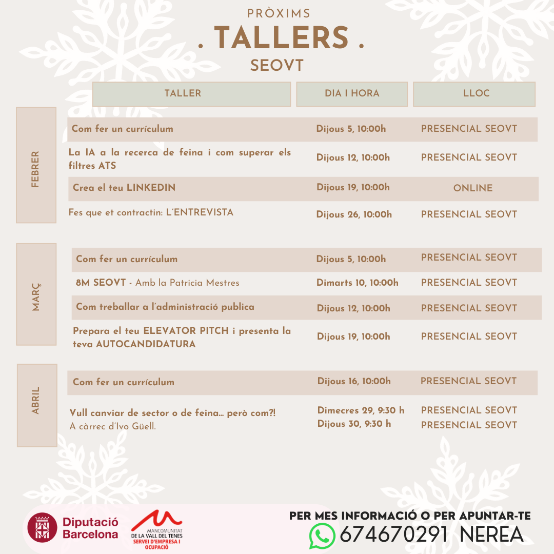 📍 Tots els tallers són presencials i gratuïts i es duen a terme a les oficines del SEOVT (Lliçà de Vall).