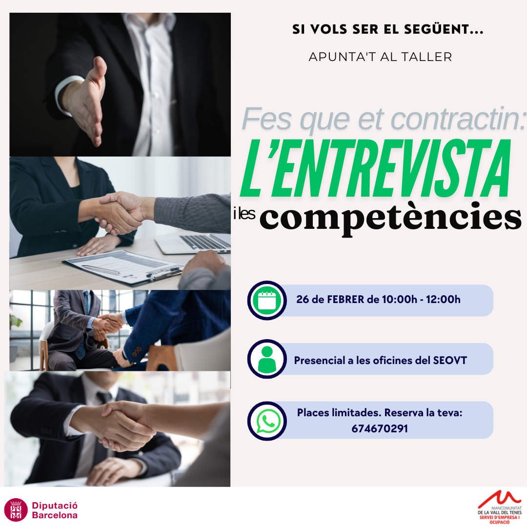 Vols aprendre a preparar-te per a una entrevista i causar una bona impressió des del primer minut? En aquest taller t’ajudarem a afrontar amb seguretat qualsevol tipus d’entrevista: presencial, telefònica o en línia.